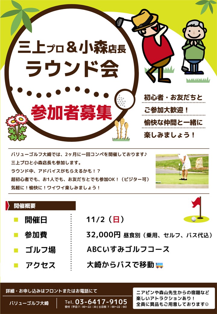 バリューゴルフ大崎にて、三上プロ・小森店長と一緒にプレーできるラウンド会を開催いたします。