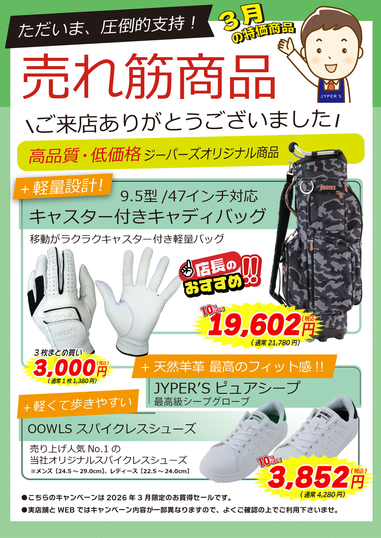 キャスター付きキャディバッグや天然羊革グローブ、スパイクレスシューズなど、ジーパーズオリジナル商品を特別価格でご提供いたします。